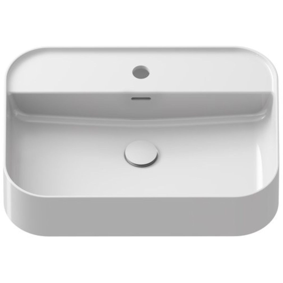 Lavabo cerámico de pared delgada Ceramic Slim diseñado para montarse sobre encimera o mueble, con rebosadero. Color blanco.