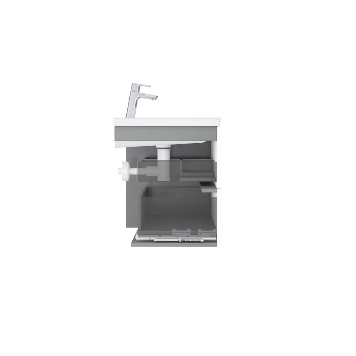 El interior del armario es de color grafito. Dos cajones con sistema de cierre silencioso proporcionan mucho espacio de almacenamiento. El armario tiene orificios perforados para tiradores, que no forman parte del mismo y deben adquirirse por separado (2 unidades). Hay tres colores para elegir: cromo brillante, negro o blanco. El armario está diseñado para el lavabo Comfort 80 sin rebosadero. El armario también se puede combinar con la encimera Comfort 80 en color blanco y un lavabo sobre encimera (por ejemplo, de la serie Uni / Uni Slim). El armario se entrega montado junto con el kit de montaje (tornillos, bisagras, tapones). Diseñado para su montaje en la pared.