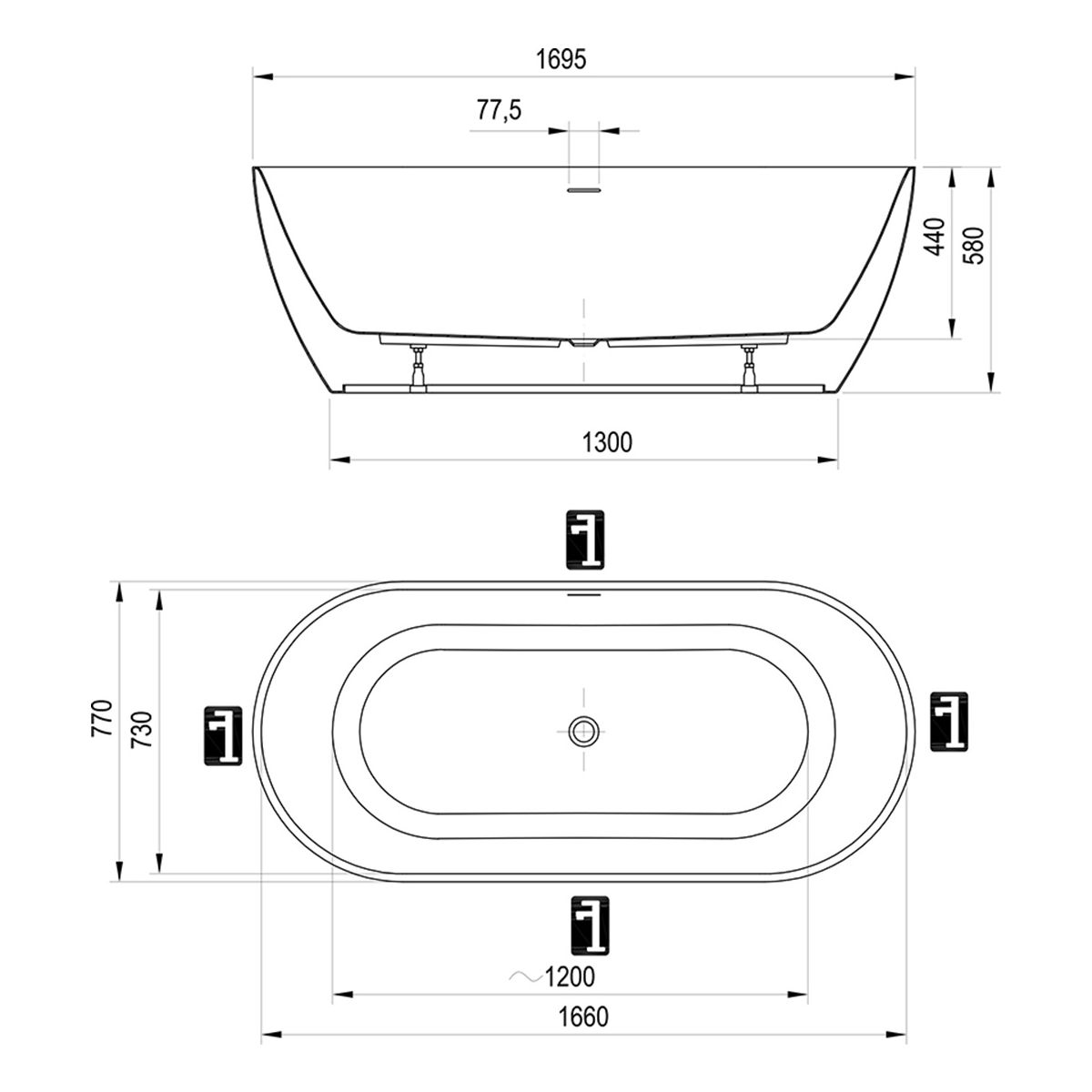 La bañera no se puede complementar con un mamparo. Toda la instalación debe realizarse bajo el suelo (tanto el desagüe como la toma de agua para el grifo empotrado). El juego de desagüe (es decir, el rebosadero y el sifón) y los soportes (patas) están incluidos. Para la bañera también ofrecemos grifos independientes para empotrar en el suelo.