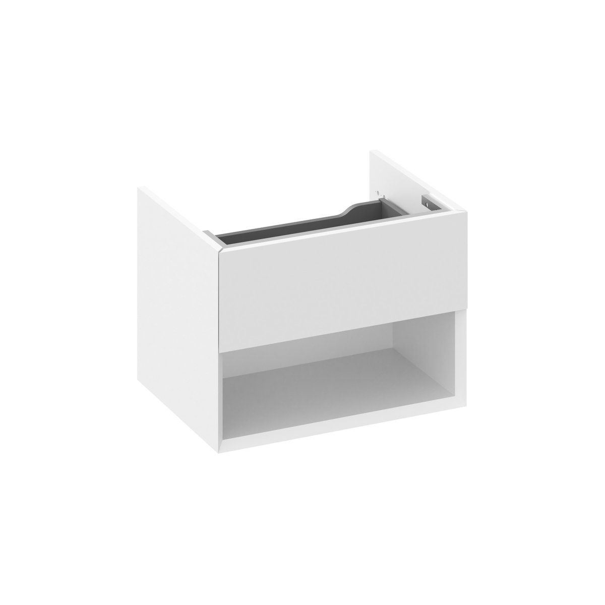 El armario para lavabo SD Lite 60 está diseñado para los lavabos Lite 60 y Lite 60/45 L/P. Está equipado con un cajón frontal y un estante. El cajón se abre tirando del borde inferior del frente. Se entrega premontado con kit de montaje (tornillos, bisagras, tacos). El mueble se monta en la pared.