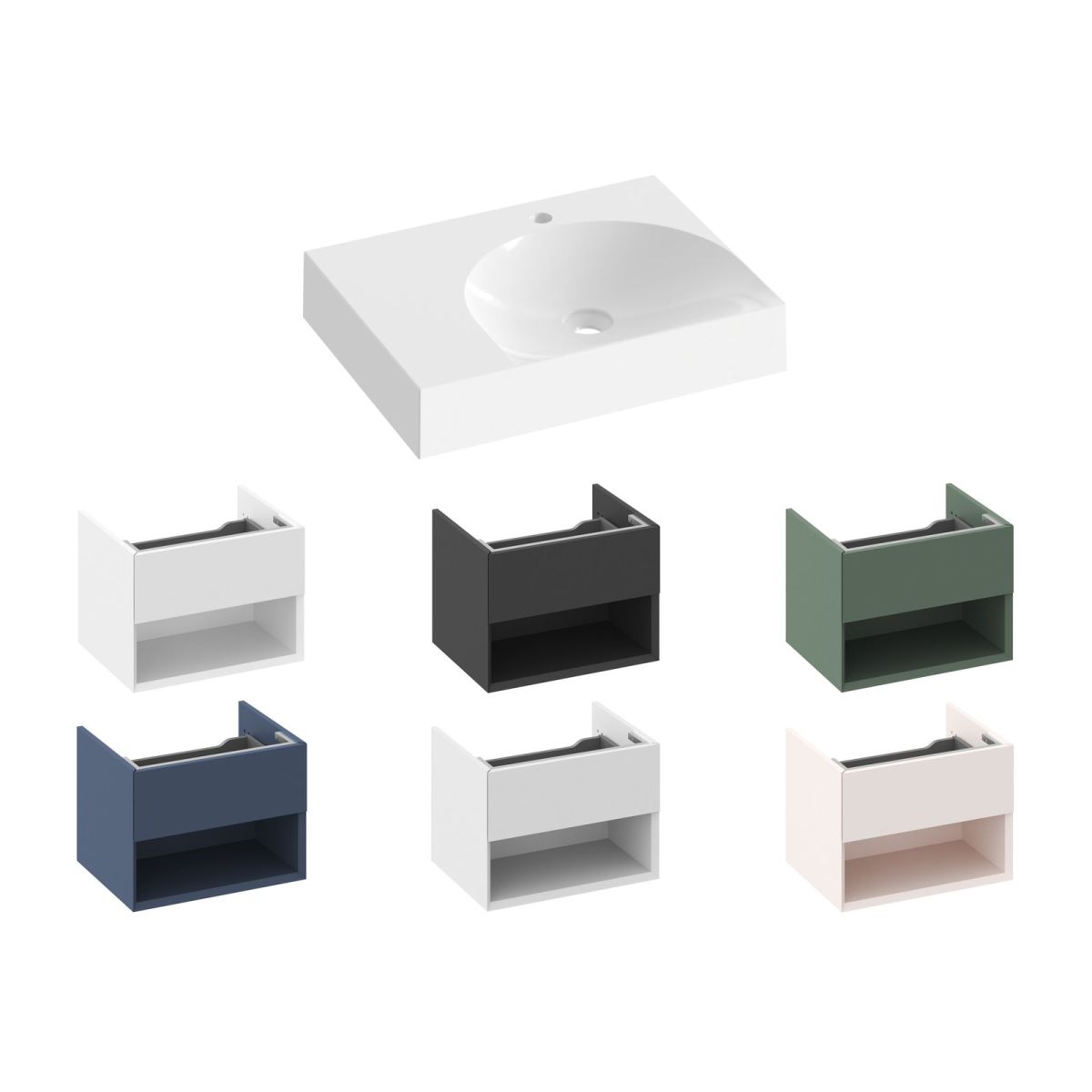 Lavabo Lite 60/45 L con espacio de almacenamiento en el lado izquierdo. El lavabo no está equipado con rebosadero, por lo que se debe utilizar un soporte fijo para evitar desbordamientos. El lavabo tiene un orificio preperforado para el grifo de lavabo de pie. El juego incluye un kit de montaje (clavijas de unión, tornillos, etc.). Se puede montar en la pared o complementar con el mueble bajo lavabo SD Lite 60.