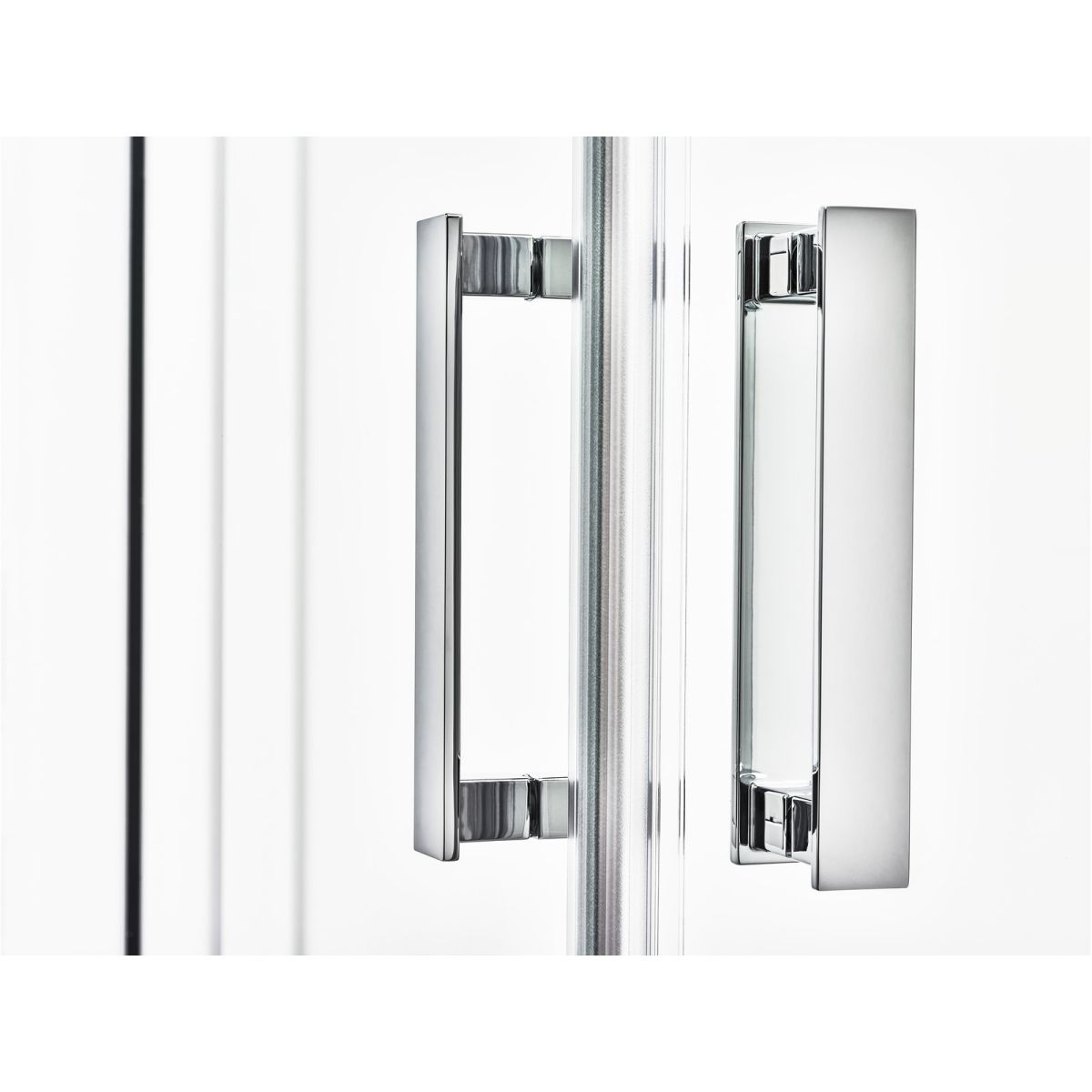 Cabina de ducha esquinera Matrix de cuatro piezas, acabada en cromo brillante con paneles de vidrio transparente con capa protectora Ravak AntiCalc®. Sistema de apertura corredero.