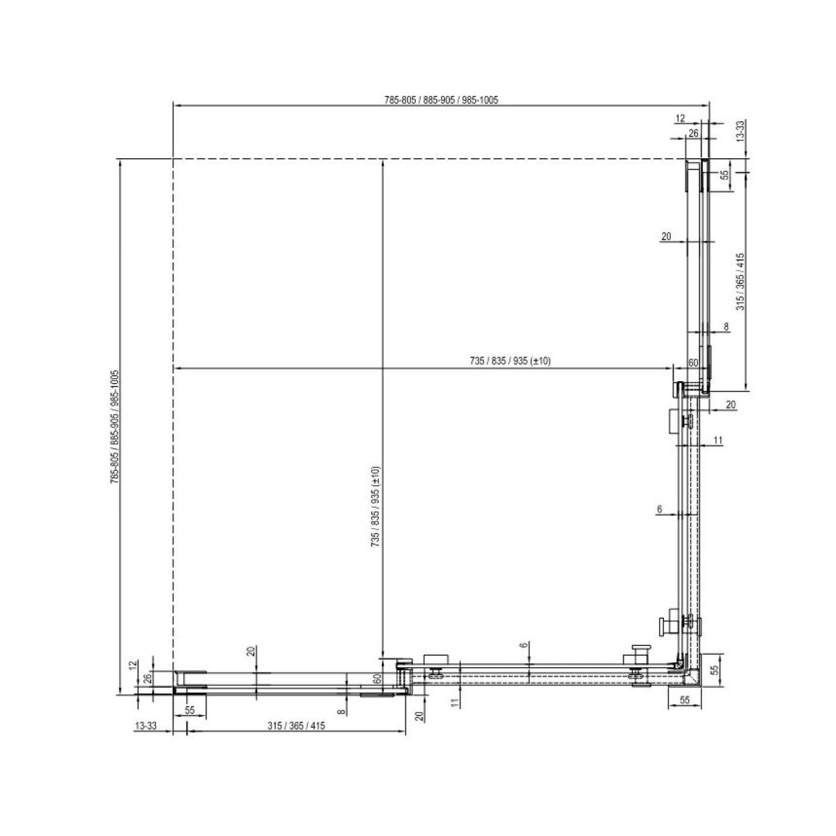La cabina consta de dos partes fijas rectas y dos partes móviles rectas que forman una puerta corredera. Montaje en la esquina alicatada del cuarto de baño, directamente sobre el suelo, con desagüe lineal integrado o rejilla de desagüe.