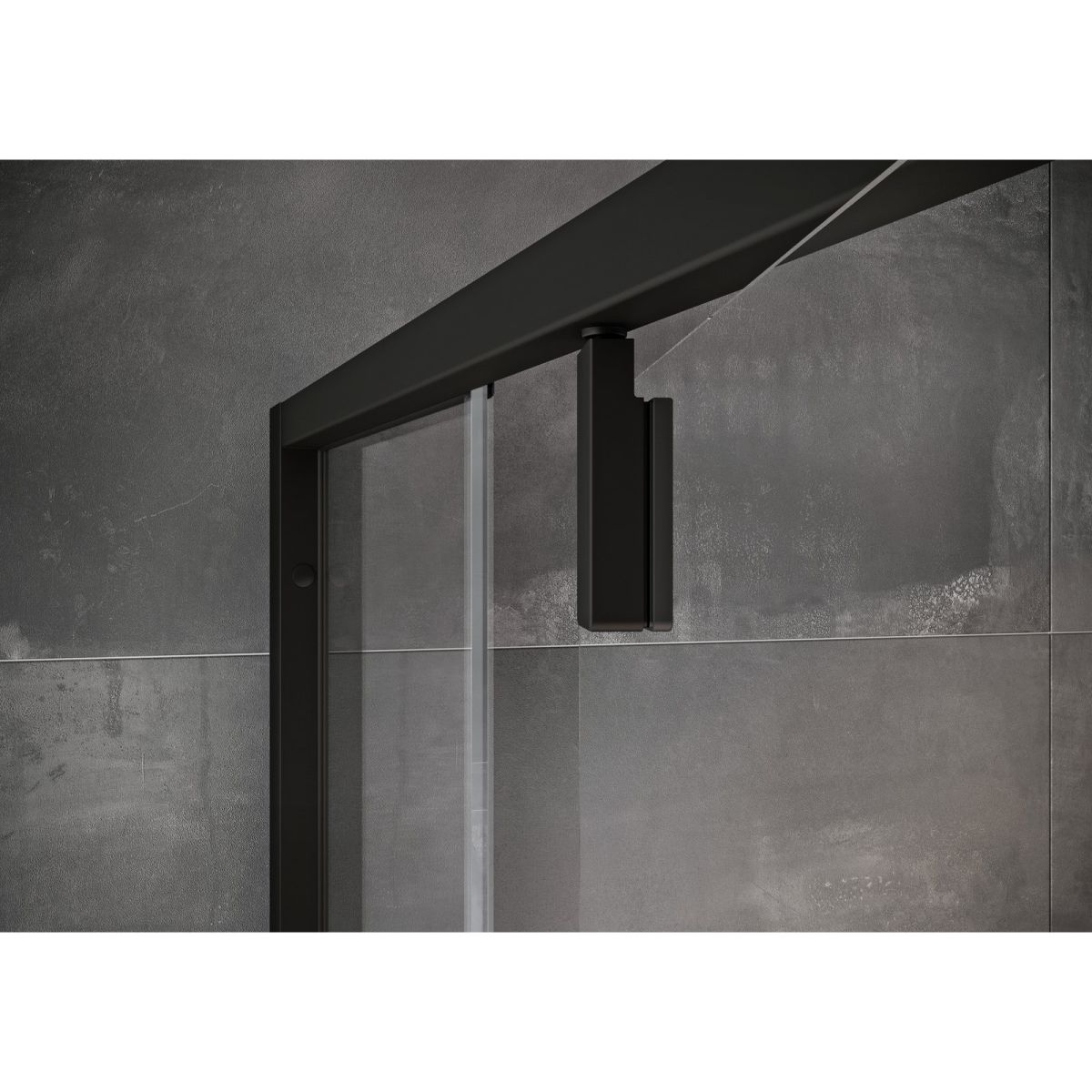 Puerta de ducha Nexty de dos piezas en color negro con relleno de vidrio transparente con capa protectora Ravak AntiCalc®. Sistema de apertura: bisagra giratoria. El producto no tiene versión derecha e izquierda.