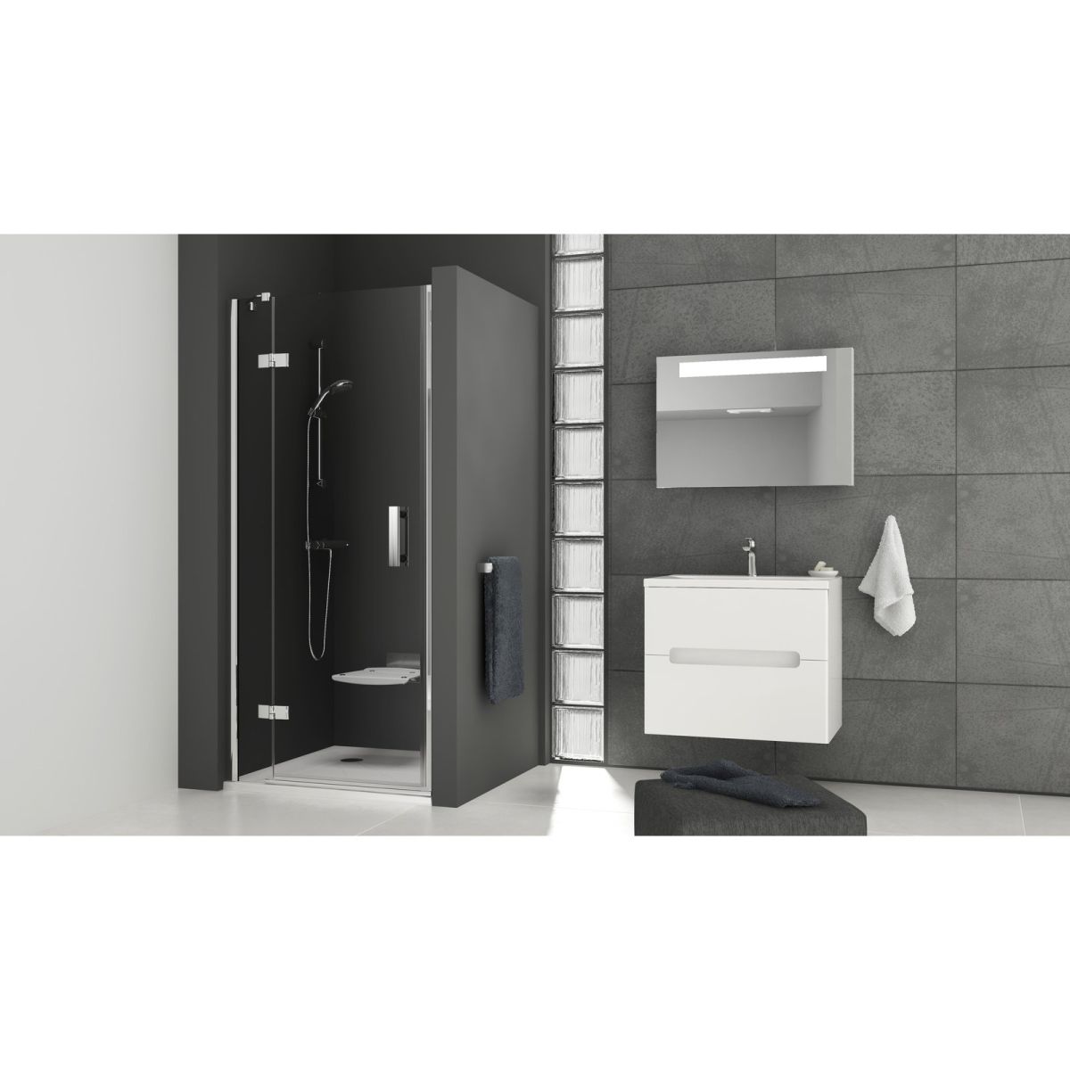 Instalación en el hueco del plato de ducha Ravak: Angela, Perseus Pro, Perseus Pro Flat, Perseus Pro Chrome, Gigant Pro, Gigant Pro Flat, Gigant Pro Chrome o directamente en el suelo con desagüe lineal integrado o rejilla de desagüe. La variante B está diseñada para huecos de construcción 16 mm más grandes que las dimensiones estándar del producto. Para la unión con una pared fija, recomendamos elegir puertas de tipo B.