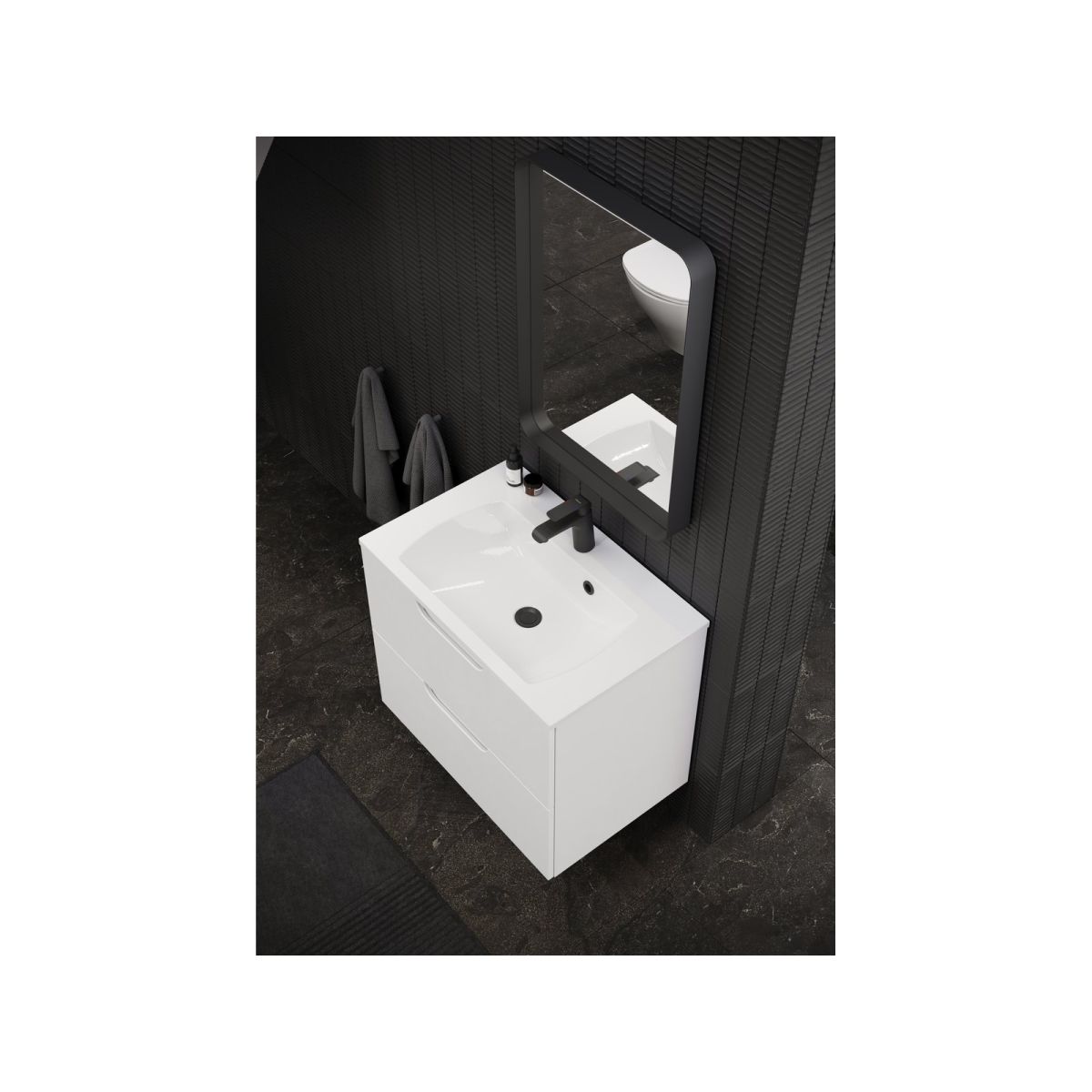 Espejo rectangular con marco fino en acabado negro. Equipado con iluminación LED.