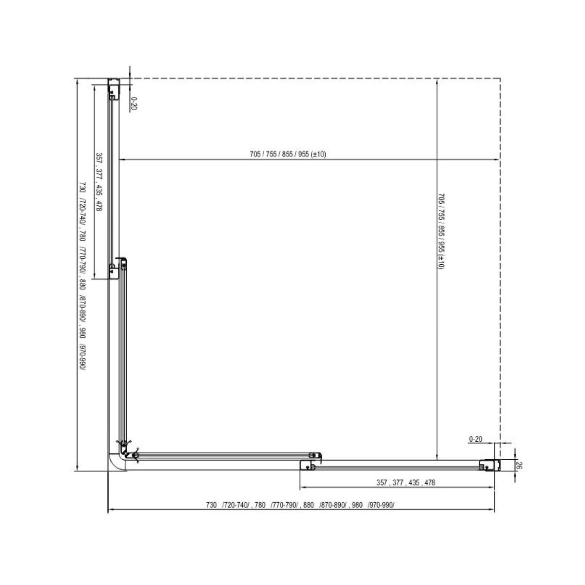 Ducha de esquina completa compuesta por dos puertas de ducha. Instalación en la esquina alicatada del cuarto de baño, directamente sobre el suelo, con desagüe lineal integrado o rejilla de desagüe. Utilizando el perfil de ampliación NPS, se pueden ampliar los productos en 20 mm, lo que permite adaptarlos perfectamente a irregularidades de hasta 4 cm en cada lado.