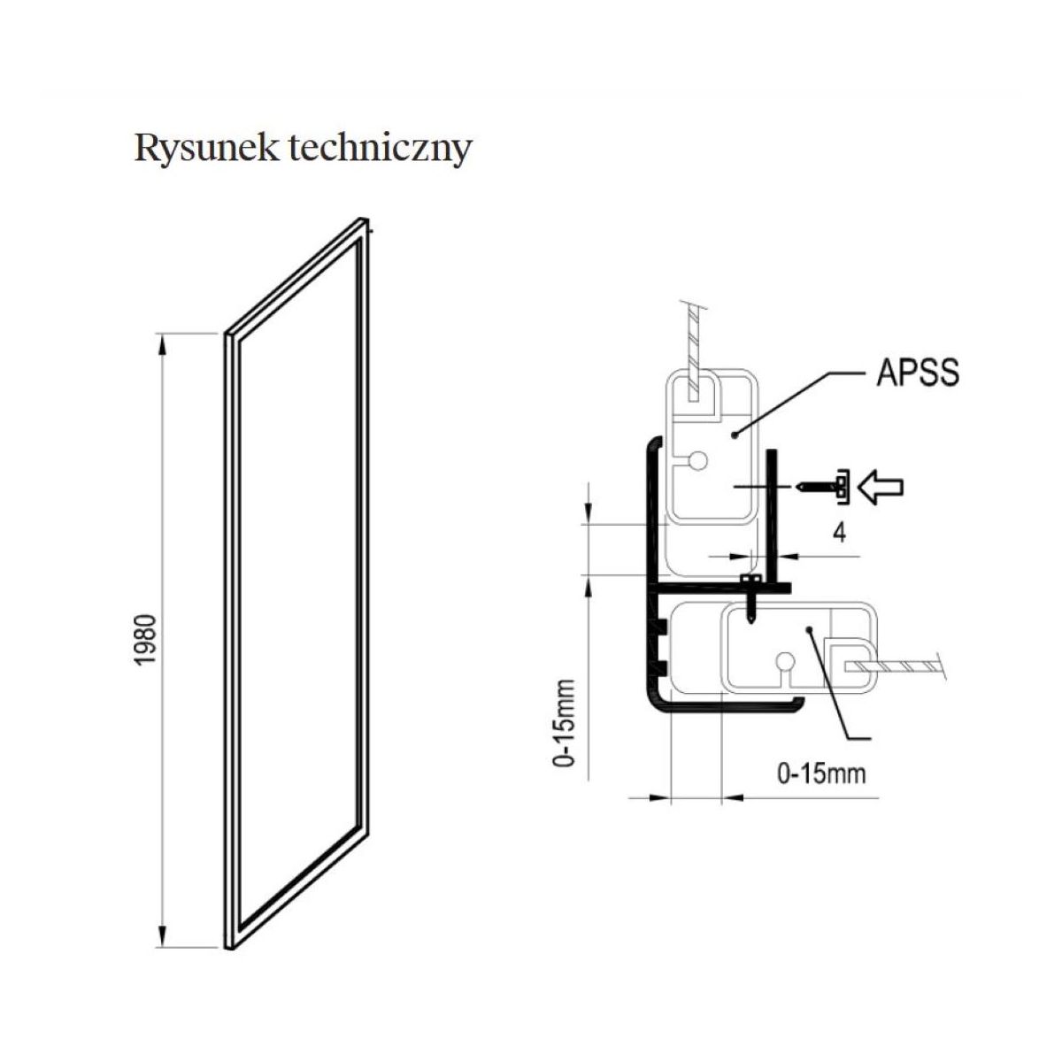 El producto consta de un solo elemento fijo y no está diseñado para su montaje por cuenta propia. El juego incluye un perfil de esquina para la unión con la puerta de ducha o la cabina de ducha. Para la fijación a la pared se utiliza un perfil de fijación, que forma parte del juego de la puerta de ducha o la cabina. Las posibles irregularidades del hueco de la obra se pueden compensar con perfiles de ampliación ANPS. La pared fija APSS se puede combinar con la puerta de ducha ASDP3 (de 1980 mm de altura) para crear una cabina de ducha en forma de «L». Con dos paredes fijas APSS y puertas de ducha ASDP3, se puede crear una cabina de ducha en forma de «U».