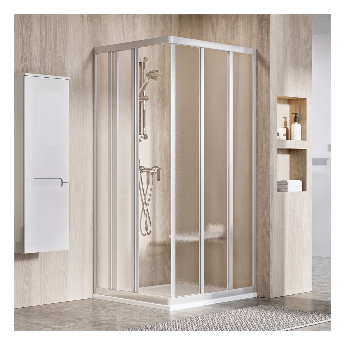 - la mampara de ducha ASRV3 + ASRV3 puede combinarse por un lado con la pared fija APSS para crear una zona de ducha en forma de U (una pared es suficiente para crear una zona de ducha completa)