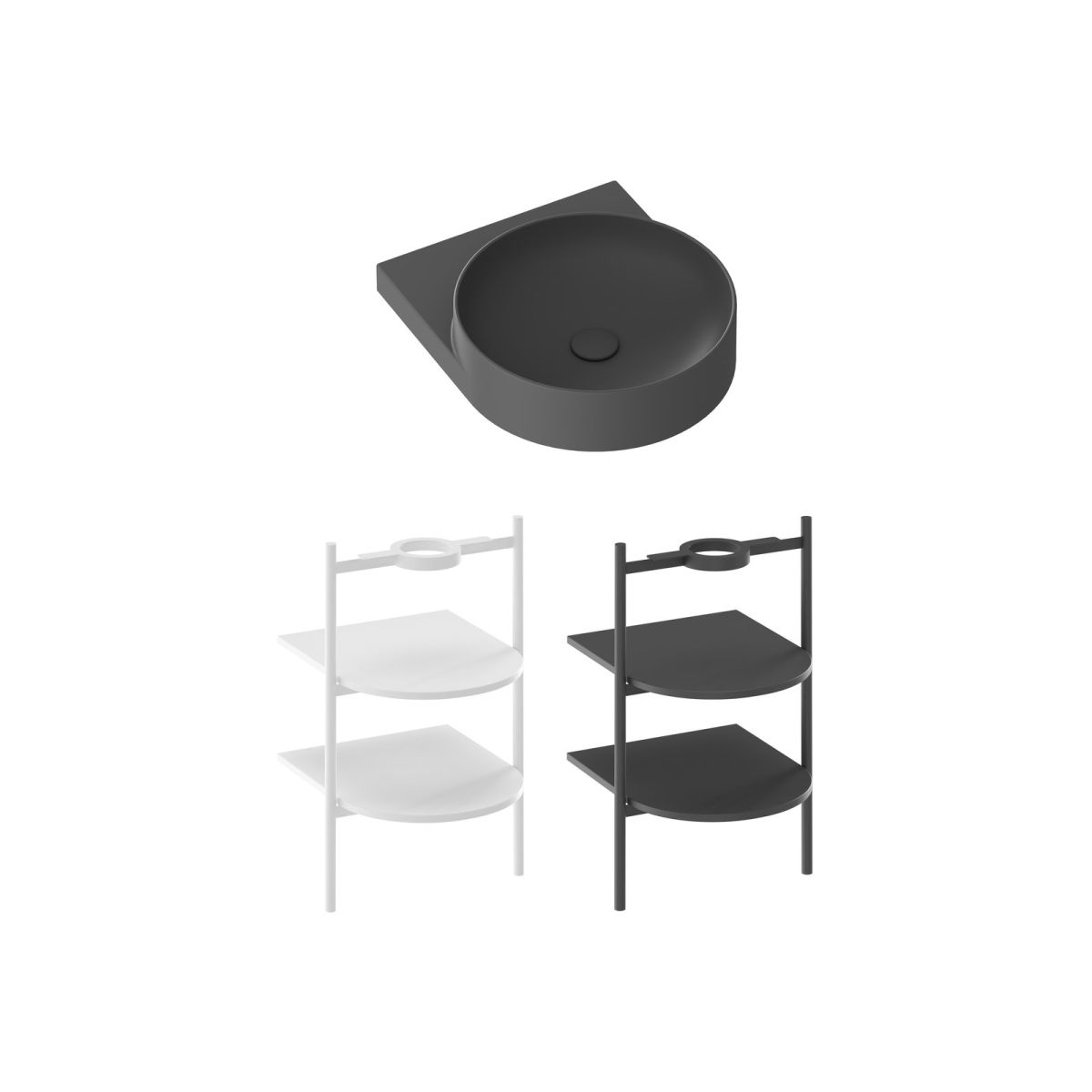 La colección Yard consta de cinco lavabos minimalistas: tres lavabos rectos y dos esquineros en blanco, blanco mate y negro mate.