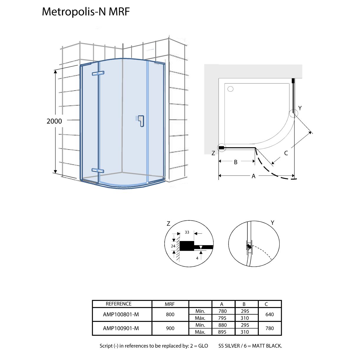 Cabina adaptada a los siguientes platos de ducha: Granada Rondo, Aeron ¼ de círculo, Terran ¼ de círculo, tamaño 90x90.