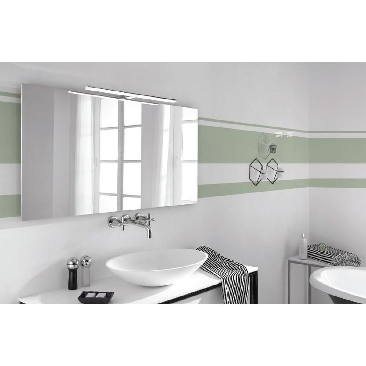 - el paquete también incluye un soporte universal, que puede utilizarse para montar la luminaria en una galería o directamente en un espejo (grosor máximo del espejo: 6 mm)