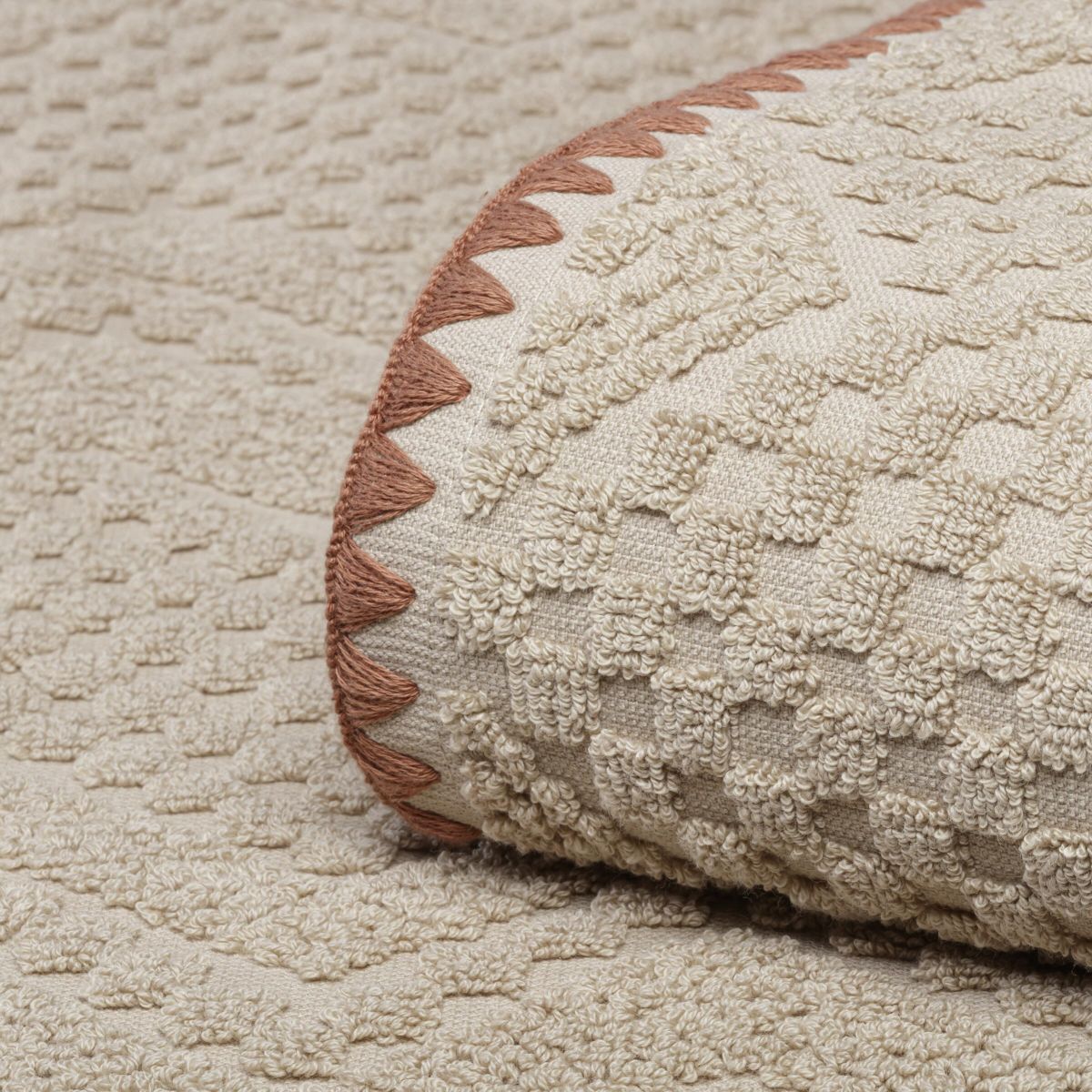 ¿Le gustaría experimentar el lujo del cuarto de baño de un hotel? La cómoda toalla Luna se lo hará posible Gracias a su grueso algodón de alta calidad (550 gr/m²), esta toalla lujosa y agradablemente grande no sólo es extremadamente suave al tacto, sino también muy absorbente. El práctico lazo permite colgarla fácilmente. El acabado bordado de la toalla, con un moderno dibujo tejido en zigzag, refleja la artesanía tradicional portuguesa. Este bonito detalle muestra el cuidado y la diligencia con que se fabrica la toalla en Portugal. El modelo en arena y terra proporciona un ambiente cálido, suave y armonioso en el cuarto de baño. Además, el algodón procede de una producción destinada tanto a proteger a los agricultores como a mejorar el producto final. En resumen, la toalla Luna es imprescindible para quienes aprecian el lujo y la comodidad
