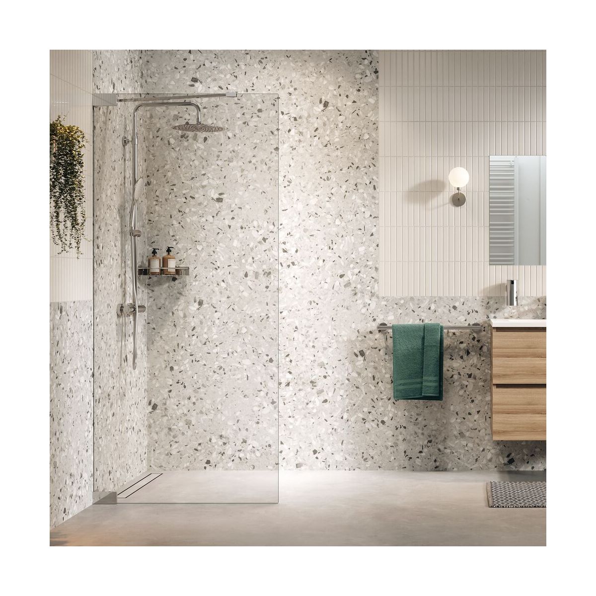 Añada un plus de confort a su cuarto de baño con la mampara de ducha Pure de Sealskin. Con una anchura de 98 cm y una altura de 200 cm, esta mampara de ducha ofrece la máxima claridad y detalles refinados. Las fijaciones de acero inoxidable de alta calidad garantizan una conexión plana con el cristal de seguridad de 8 mm de grosor con revestimiento antical. Esto mantiene el cristal limpio y facilita su limpieza después del baño. ¿Quién no querría eso? La mampara de ducha dispone de una barra estabilizadora que puede montarse en cualquier ángulo o perpendicular al cristal. La sección central de aluminio también puede acortarse fácilmente. La barra estabilizadora y las abrazaderas del cristal tienen un acabado cromado de alto brillo atemporal.