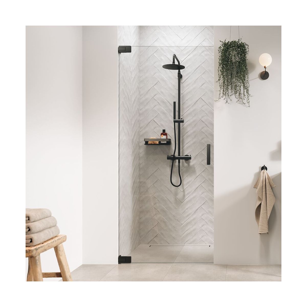 Añada un plus de comodidad a su cuarto de baño con la puerta batiente Pure para el nicho. Con su diseño minimalista, su cuarto de baño parecerá inmediatamente espacioso y abierto. La puerta tiene 79,5 cm de ancho y hasta 200 cm de alto, lo que proporciona más calidez y comodidad al bañarse. Las fijaciones de acero inoxidable de alta calidad garantizan una unión plana con el cristal de seguridad de 8 mm de grosor con revestimiento antical. Esto mantiene el cristal limpio y facilita su secado después del baño. ¿Quién no querría eso? Esta puerta abatible puede abrirse hacia dentro o hacia fuera y está equipada con un sistema de cierre automático que facilita el cierre. Las bisagras y el tirador están acabados en gris cepillado. Un acabado sofisticado y elegante que se adapta a un cuarto de baño moderno y minimalista.