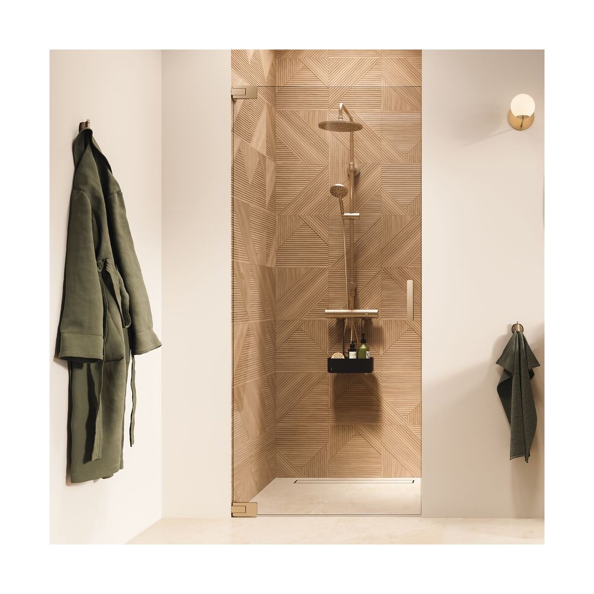 Añada un plus de comodidad a su cuarto de baño con la puerta batiente Pure para el nicho. Con su diseño minimalista, su cuarto de baño parecerá inmediatamente espacioso y abierto. La puerta tiene 89,5 cm de ancho y hasta 200 cm de alto, lo que le proporciona más calidez y comodidad al bañarse. Las fijaciones de acero inoxidable de alta calidad garantizan una unión plana con el cristal de seguridad de 8 mm de grosor con revestimiento antical. Esto mantiene limpio el cristal y facilita su secado después del baño. ¿Quién no querría eso? Estas puertas batientes pueden abrirse hacia dentro o hacia fuera y están equipadas con un sistema de cierre automático que facilita el cierre. Las bisagras y el tirador tienen un sutil acabado en oro cepillado. Esto dará a su cuarto de baño un aspecto lujoso.