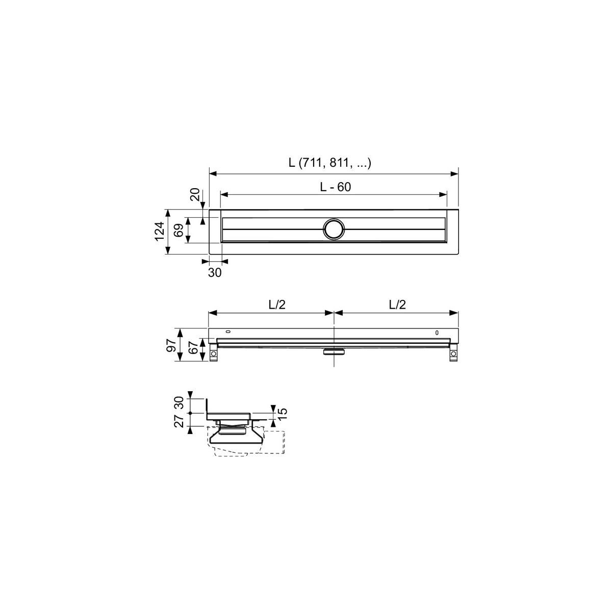 - longitud del canalón con brida 711 mm