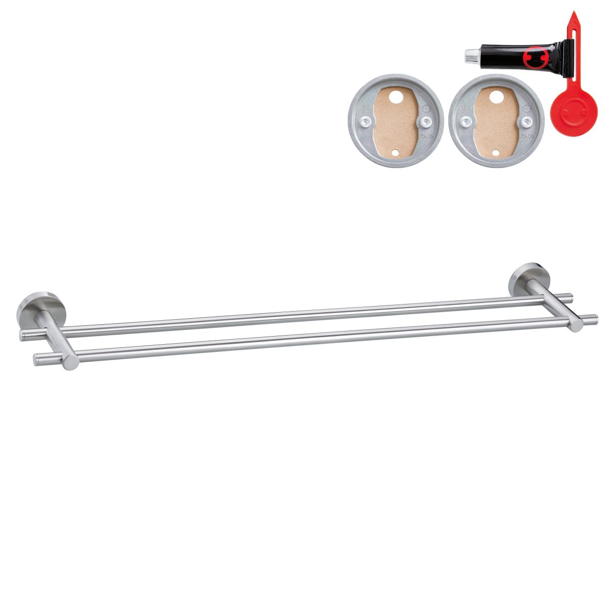 El toallero autoadhesivo puede fijarse fácilmente sin necesidad de taladrar. Está fabricado con un acabado de acero inoxidable mate (en el que no se ven las huellas de los dedos) que realza su aspecto elegante. Puede colgar en ella dos toallas grandes y estar seguro de que se secarán perfectamente. Resistente al agua: ideal para el cuarto de baño. Gracias a la tecnología autoadhesiva patentada, que es una combinación de adaptador y compuesto adhesivo, el toallero es fácil de instalar. Como no es necesario taladrar para fijar este accesorio, las paredes y los azulejos permanecen intactos. Si desea colgarlo en otro lugar, puede retirarlo fácilmente de su posición original y fijarlo en otra con el adaptador BK20-2.