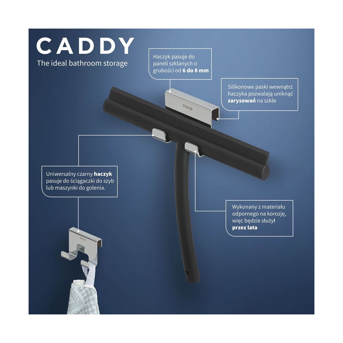 Lo pequeño es hermoso, y el gancho para mampara de ducha Tiger Caddy es una pequeña belleza que causa un gran impacto. Cuelgue el gancho en su cabina de ducha o panel de cristal. El cristal queda permanentemente protegido gracias al revestimiento de silicona. El gancho es adecuado para colgar una escobilla de goma, una maquinilla de afeitar o toallas; sencillo, funcional y lujoso. Caddy es la clave para una sensación de serenidad en su cuarto de baño.