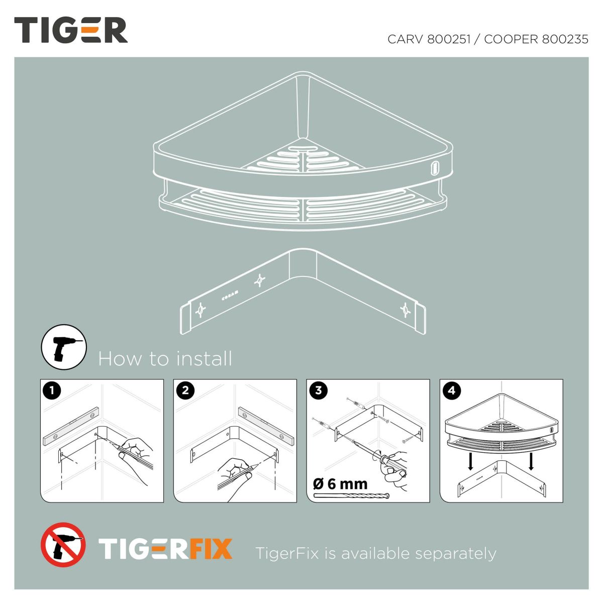 Los accesorios Cooper se instalan fácilmente con TigerFix, nuestro truco para los que no quieren taladrar la pared. Con TigerFix, puede montar rápida y fácilmente nuestros accesorios en una superficie lisa y sólida. TigerFix está disponible por separado.
