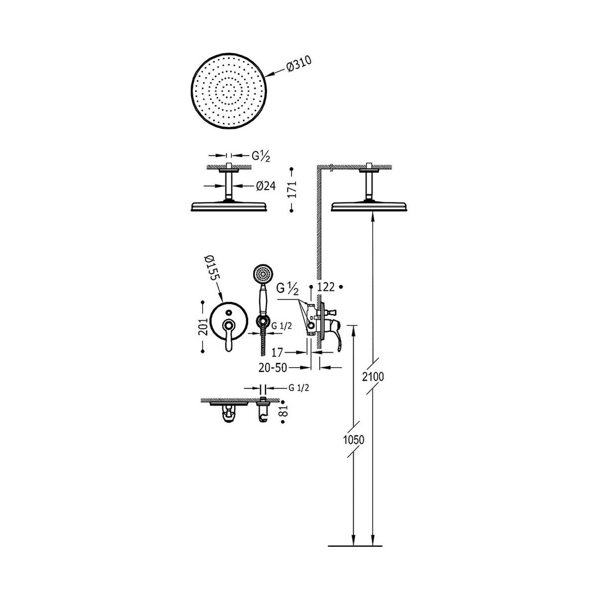 - Incluye: grifo con conmutador, ducha con efecto lluvia, alcachofa de ducha, manguera de ducha, brazo de ducha, conexión en ángulo