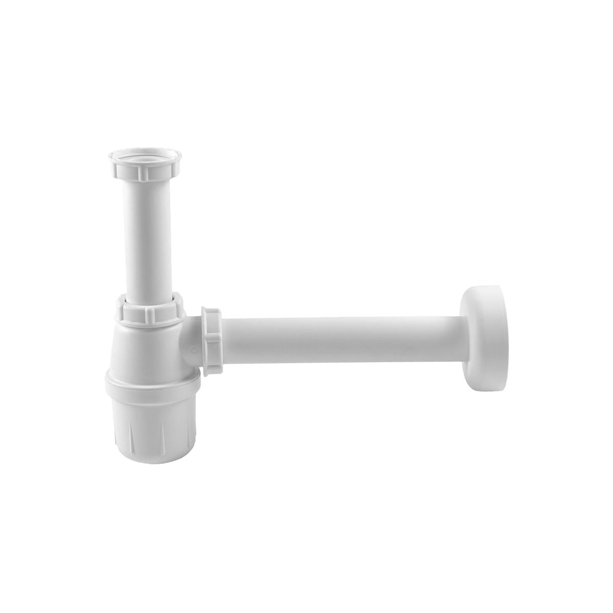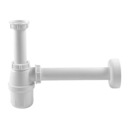 Un sifón de lavabo blanco con forma de botella y diseño sencillo. La ventaja de este producto es su bajo precio y su alta calidad. Debido a su escaso valor estético, el sifón es ideal para instalarlo debajo de un lavabo o pedestal, es decir, donde no sea visible a primera vista.