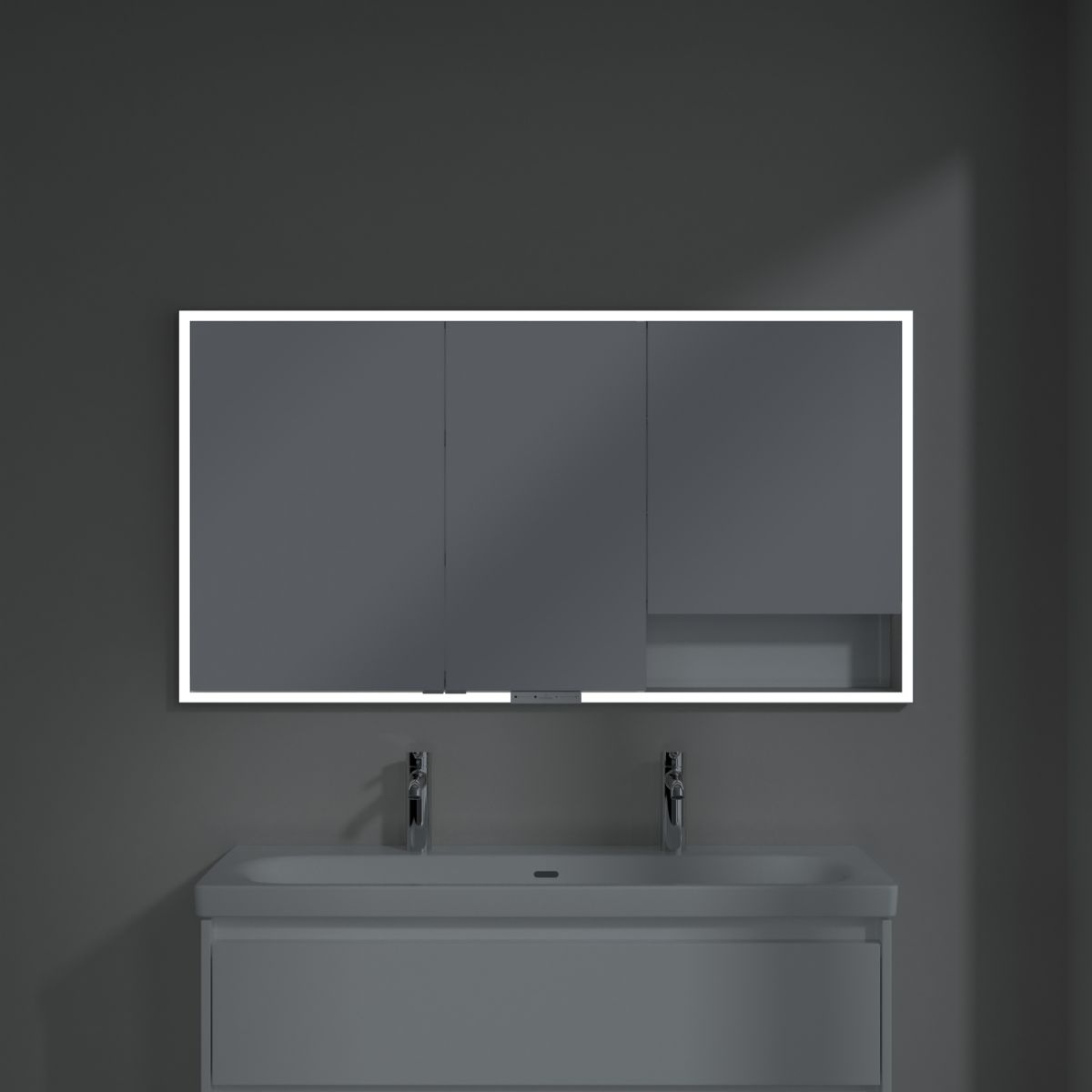 La tira LED que rodea el espejo proporciona una iluminación uniforme, mientras que la iluminación integrada del lavabo y los compartimentos abiertos iluminados crean un ambiente acogedor. La luminosidad y la temperatura del color se pueden regular cómodamente mediante un sensor o un controlador Smart Home. Las delicadas manillas permiten abrir cómodamente las puertas sin dejar huellas dactilares, y la doble toma de corriente en el interior proporciona una funcionalidad adicional.