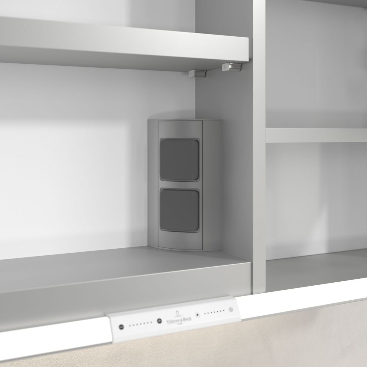La tira LED que rodea el espejo proporciona una iluminación uniforme, mientras que la iluminación integrada del lavabo y los compartimentos abiertos iluminados crean un ambiente acogedor. La luminosidad y la temperatura del color se pueden regular cómodamente mediante un sensor o un controlador Smart Home. Las delicadas manillas permiten abrir cómodamente las puertas sin dejar huellas dactilares, y la doble toma de corriente en el interior proporciona una funcionalidad adicional.